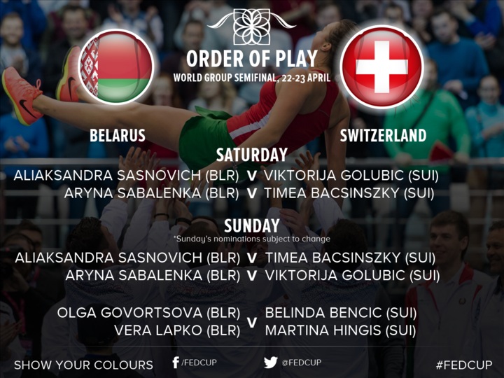 Во второй день, 23 апреля, в 12.00 на корт выйдут первые номера команд — Александра Саснович и Тимеа Бачински, после завершения этой игры сразятся Арина Соболенко и Виктория Голубич. Завершит соревновательную программу парная встреча. Белоруски Ольга Говорцова (парный рейтинг № 187) и Вера Лапко (парный рейтинг № 171) сыграют против швейцарок Мартины Хингис (№ 8) и Белинды Бенчич (№ 451).