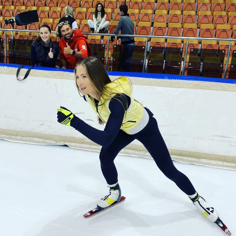 А еще биатлонистка пробует новые виды спорта. «Начинающая конькобежка», — так назвала себя сама Домрачева.
